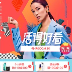 性格男装每满300-30,时尚女鞋每满300-30,运动鞋服每满300-30,早春大牌每满300-30,茵曼全场3件7折,巴黎欧莱雅爆款低至3.5折。
