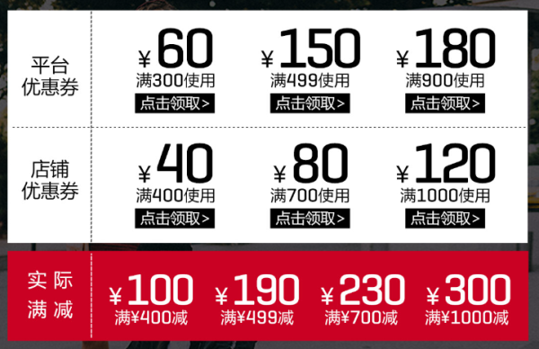 领60-180元平台券,再叠加40-120元店铺券,实际满400-100,满499-190,满700-230,满1000-300