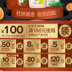 专区1元抢购,领99-50元优惠券,领119-5元自营通用优惠券,满188打8折优惠券,领199-80/199-120元滴露品牌券。