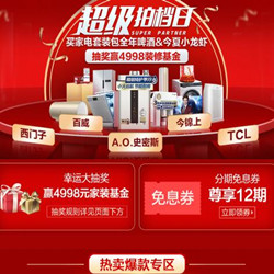 苏宁超级拍档日,抽奖赢4998元装修基金!苏宁开启了超级拍档日专场促销活动,买家电可抽奖有机会赢4998元家装基金,更有12期免息券限时抢。