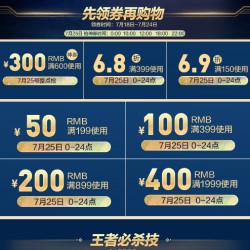 购物先领199-50,399-100,899-200,1999-400元优惠券,还可领满150打6.9折/满399打6.8折优惠券,活动仅限7.25日一天。