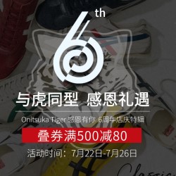 京东鬼冢虎6周年庆,领300-30元平台券,可与25-20,500-50,600-50,1200-100元店铺优惠券叠加使用,叠加后满500减80