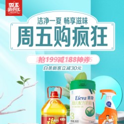 京东超市周五购疯狂,部分2件5折,抢199-188神券,白条新客领30元无门槛优惠券,满499减50,满159减15。