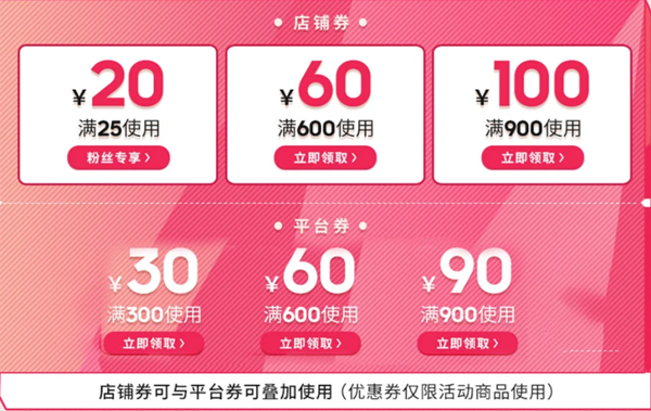 活动页可领25-200,60-60,900-100元店铺券,再叠加300-30,600-60,900-90元平台券。