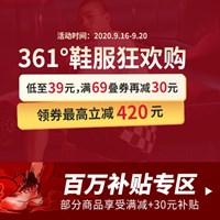 京东361度鞋服狂欢购,低至39元,满69元叠券再减30元,领券最高立减420元,活动时间9月16日-9月20日。