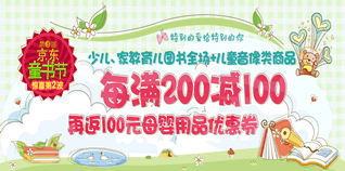 即日起5月20日,京东商城开展了一个少儿图书促销,少儿、家教与育儿类图书,部分音像类商品,满200减100元,满400减200元......多买多减,上不封顶。活动力度相当于5折,不少套装书也参加活动。且单张订单按实际支付金额满100元可返100元东券(2张199-50元母婴东券)。