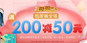 京东商城名品母婴家第二波 ,至2013年5月31日,辣妈尊享单品5折封顶,全场帮宝适、妈咪宝贝、好奇、大王等品牌纸尿裤满200直减50元;更有十大奶粉品牌联合促,满498减120元。
