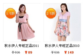 秋水伊人专柜2011裙子111109018,2个尺码可选,仅售50元;秋水伊人专柜2010裙子106302001,粉红色、淡粉色可选,仅售79元。大牌低价,喜欢秋水伊人的妹纸可以去选购!全部商品价格由低到高列表点此链接。貌似运费有点小贵,妹纸们可以和姐妹一起购买,上品折扣网运费是按一单一单算的。