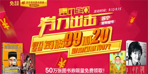 苏宁易购图书频道惠动全网大促开始啦,即日起至2013年9月15日,全场畅销图书、热卖新书每消费满99元可立减20元,高可直减100元。活动涵盖了郭敬明、韩寒、桐华、南派三叔、郭德纲的经典文艺巨作以及婴童读物、生活百科、人文社科、教育知识等品类书籍。