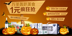 1号店万圣节美食趴升级,1元美食疯抢、39元/69元/99元/199元3件、爆款美食3折起疯抢、满150元送50元满减券的四大主题活动同时进行。其中,多款商品均是历史新低价出售,吃货们可不要错过咯!
