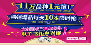 目前,京东商城图书3周年庆典,电子书钜惠到底专场促销,畅销爆品每天10本限时抢,还有11万品种电子书1元抢。活动主要包括三个专区:经管励志、生活社科、文学小说。