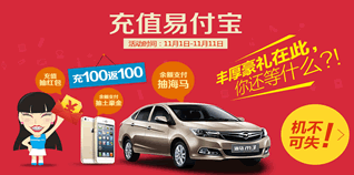 11月1日-11日,苏宁易购020购物节,易付宝充值满100送100,充值还可抽红包,使用易付宝余额支付还能抽海马、抽土豪金。活动期间,每天00:00-23:59的24个整点开抢,每个通过实名认证同时绑定快捷支付的账户,充值100元可抢100元易付宝券(单笔订单满200元可用)。