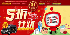 1号店双11开门红5折狂欢预热波,2013年11月1日-11月3日,爆款单品低至5折,指定活动专区商品免费领取,食品牛奶/家居家电满99减20元、母婴/厨具满199减50元、服饰鞋帽满299减60元,洗护个护高满199减100元,全场购物满99元再送价值80元的全场券。