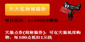 天猫商城现在退出了一个天天签到领天猫点券的活动,每日签到随机赠送1~1000点猫券,天猫点券(又称猫券)可直接用于天猫购物抵扣现金,每100点抵扣1元。