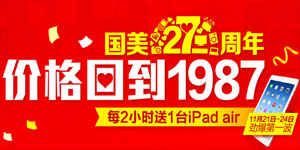 国美在线27周年庆波活动预告,明日即2013年11月21号至11月24号,国美联合百大国际知名品牌免费送出家电、厨卫生活、3C数码的各种好券。其中,多款活动商品更是低至全网底价出售,号称价格恢复到1987年的水平,感兴趣的朋友们明天可以去凑个热闹!