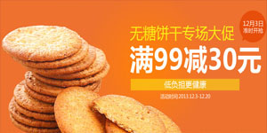 顺丰优选进口无糖饼干专场大促,即日起至2013年12月20日,全场单笔订单消费满99元立减30元,整体商品单价与其他同类型B2C商城持平,凑单满减后相当于是7折的优惠。活动页面还有对无糖饼干的各国标准进行介绍,建议平常喜欢吃点小零食又怕有负担的朋友去看看!