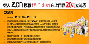 2013年12月05日—12月08日,直接通过浏览器网址栏键入亚马逊短域名Z.cn,登录亚马逊官网,即可获得博洋家纺床上用品满60元立减20元的优惠券,此券可用于购买本活动页面的博洋家纺商品。优惠券仅限购买本活动专区的亚马逊自营商品,每个账户限领取一张,不与其他优惠促销活动共享。
