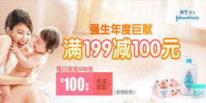 京东商城强生婴儿用品年度巨献,活动在线发放全场满199减100元优惠券(东券),优惠券即领即用,有效期从领取之日起到次日24点,过期作废。领取时间从2013年12月9日至12月13日上午9点半,活动期间同一用户ID每天仅限领取一张,不支持与其他优惠券叠加使用。本此满减东券每天限量600张,领完即止。