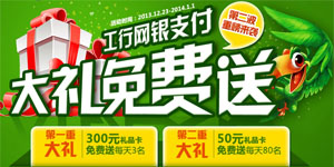 顺丰优选工行网银支付大礼免费送第二波活动开始啦!2013年12月23日至2013年01月01日,每天在顺丰优选购物通过工行直连支付的前3名用户,可获得300元礼品卡,前80名购物满150元的用户可获得50元顺丰优选电子礼品卡。