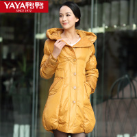 鸭鸭女士中长款连帽修身羽绒服B-123,金黄色、洋黄色可选,尺码齐全,1号店“鸭鸭官方旗舰店”价108元包邮,非常实惠!同款羽绒服,国美在线258元,天猫商城198元。