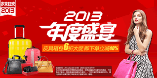 12月26日10点-18点,京东商城岁末狂欢,皮具箱包6折大促。活动期间,购买京东自营箱包品类商品(即商品编码为6位或7位的商品,个别商品不参加,尤其是品箱包不参加活动),下单立减订单金额的40%。