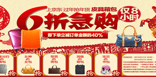 1月14日10:00-18:00,京东商城过年抢年货,皮具箱包6折急购!活动期间,购买京东自营品类箱包商品(即商品编码为6位或7位的商品),下单立减订单金额的40%。活动仅限8小时,需要购买的朋友务必抓紧时间。