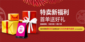唯品会新会员(即无购物记录)福利——于2014年1月20日至1月21日,在特卖会首单成功购物满68元,即可获赠唯品会2014年限量版台历一本,数量有限,送完即止;台历内含120元年度代金券(12张满50元减10元代金券),激活后每月自动激活一张,当月有效,券码有效期至2014年12月31日。