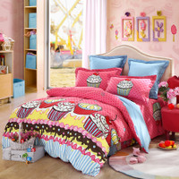 躺在床上进入了童话的神奇国度,在香浓的巧克力奶油里做个了甜甜的美梦。轻轻闭上眼睛,会说话的小蛋糕们一起来场梦幻旅游吧。甜美可爱的粉调,配合童趣梦幻的卡通蛋糕,婴儿安全等级的棉质,让萝莉控们尖叫。采用高支高密纯棉品质,用心呵护孩子们娇嫩的肌肤。三件套包含:被套、床单、枕套。