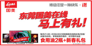 国美在线东莞用户新春购物送好礼!每天晚上21:00点-次日8:00点间在国美在线下单购买购买冰箱/洗衣机/空调/彩电等大家电,配送地址为东莞市区域的用户除了可获额外获赠食用油2瓶+新春大礼包。活动期间,用户还可同时享受国美在线的超低折扣,东莞市区域的朋友不妨去看看吧!