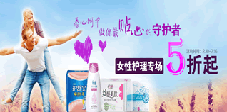 苏宁易购情人节女性护理专场促销,全场5折起。活动分为多个品牌折扣专区,包括:倍舒特/薇尔5折专区、ABC/Free/护舒宝/朵朵/采幽6折专区、高洁丝/怡丽/美体舒/洁尔阴7折专区和苏菲9折专区。