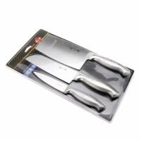 本套装为片刀、小厨刀、水果刀的三件组合产品,其刀体采用的优质不锈钢制成,经过特殊的淬硬处理,刀韧锋利、耐用;刀柄经过人性化设计,符合人体工学原理,使用更舒适;采用独特的刀刃开封方法,锋利度持久、耐用、易磨;其造型线条流畅,做工精细,手感舒适,适合厨房剪切各类肉片、蔬菜等。
