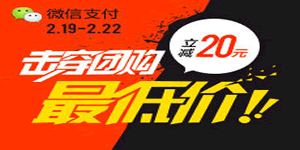 即日起至2月22日,大众点评网团购优惠,击穿团购低价,首次使用手机微信支付的用户,在大众点评网或大众点评团购客户端,购买任意大于20元的团购立减20元。非首次手机微信支付的用户,立减10元。
