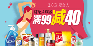 易迅网3.8宠爱女人节,洗护化妆联合促销,全场满99减40元。活动分成多个专区,如:联合利华满99减40元、宝洁满139元减50元、女性护理满99减40元、纸品清洁满138减38元、母婴用品满99减20元专区。