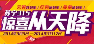 苏宁易购已经开始在进行315的活动了,时间持续至2014年03月17日,专题为“惊喜从天降”,其主体分为10亿元云券免费领、易付宝充值抢红包、时时购物赢免单这三个活动,感兴趣的朋友不妨一看!