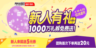 即日起至4月23日,1号店团购频道新人有礼,1000万礼券免费送!新人来就送5元团购专享券,每日限量领取10000份,先到先得。活动时间有限,还没在1号团消费过的朋友都可以去领取啦。