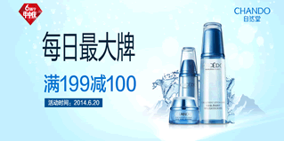 苏宁易购美妆每日大牌今日品牌——CHANDO自然堂美肤专场,全场满199元减100元。活动商品丰富,从洁面到爽肤、保湿、滋润等一应俱全。近期需要买化妆品的妹纸可以去看看。