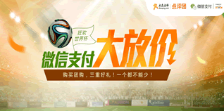 即日起至6月30日,凡微信支付的新用户,在大众点评团通过微信支付购买任意团购,获得抵用券,抵用券低价值20元,高200元。此券适用于美食、休闲娱乐、电影、丽人类目、酒店旅游,有效期7天。另从现在起至7月13日,凡微信支付用户,在大众点评团购买任意团购,均可获得1注世界杯彩票。