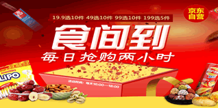 京东商城“食间到”,每日2小时,19.9元任选10件起。活动分为四个大块:19.9元选10件专区、49元选10件专区、99元选10件专区、199元选5件专区。吃货们可以去选选。
