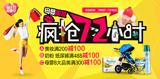 7月8日-10日,苏宁易购推出“母婴美妆疯抢72小时”活动,全场高满200元减100元。活动包括:奶粉纸尿裤满488减100元、母婴8大品类满300减100元、美妆满200减100元、名店72小时狂嗨、1元疯抢等专区。