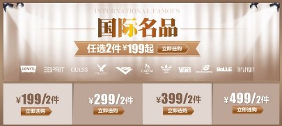 优购网国际名品贺岁专场,任选2件199元起。活动分为以下专区:2件199元专区、2件299元专区、2件399元专区、2件499元专区。男女上装、下装、鞋靴等均可选择。