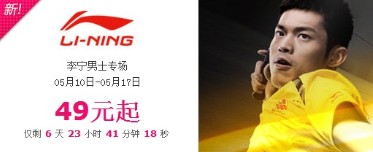 5月10日-5月17日,好乐买新上线栏目“限时特卖”之Li-ning李宁专场特卖,全场运动服饰鞋,低39元起。价格非常给力!好的款式当然是手慢无,朋友们下手需快。李宁男士专场、李宁女士专场。