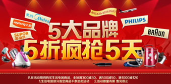 苏宁易购五大生活电器品牌联合促,于2013年5月6日-5月7日,全场满300-30元、满500-50元、满1000-120元,每天还有两款热卖生活家电5折限时限量。
