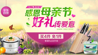 京东商城五月母亲节感恩回馈,即日起至2013年5月13日, 全场自营商品买四件免一件,相当于是买三件送一件。若是首次使用京东手机客户端下单的买家还可获得5元无限制京券。