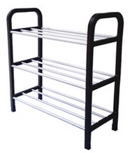 简易多功能三层鞋架,由塑料架子和防锈铁管组合而成,每层可放两双鞋子,三层共放六双鞋子。