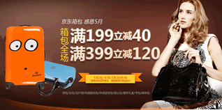 5月2日9:30—5月3日9:30,京东商城自营箱包全场满199减40元、满399减120元。活动商品为,京东日用百货箱包自营产品(商品编号为6位数的商品)。美旅、雅士、外交官等品牌均参加活动。