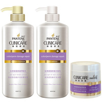 这款套装包括三件产品:潘婷clinicare染烫损伤修护洗发露600ml+潘婷clinicare染烫损伤修护护发素600ml+潘婷clinicare染烫损伤修护润发膜150ml。潘婷臻致染烫损伤修护洗护发系列,针对化学损伤的发质,修护秀发积年损伤,令秀发重获健康,彷如新生。