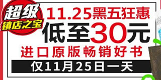 亚马逊进口原版畅销好书促销专场,疯狂,低至30元。亚马逊目前开启了一个进口原版畅销好书的专场促销活动,40套超级畅销经典进口原版图书,价格直降,低至30元起。参与活动的包括艺术与摄影、商业与财富、动漫与绘画小说、计算机与科技、烹调、医学、推理与惊悚等方面的书籍,类目还是很齐全的。活动时间仅限11月25日,有喜欢看书的朋友可以去逛逛!