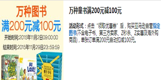 活动形式:点击“领取优惠券”后,购买亚马逊自营指定图书(不含电子书、第三方卖家、Z、Z实惠及海外购商品),单张订单满200元自动扣减100元。