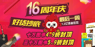当当网6周年庆后一周,图书大促销,十万图书4.9折封顶,三十万图书5.9折封顶!当当网16周年庆促销活动后一周优惠,好货抄底,现在入场即可选购更超值的商品!图书品种包括:小学、文学、童书、艺术传记、青春动漫、成功励志、经济管理、投资理财、历史文化、哲学心理、人文社科、保健养生、亲子早教、旅游美食、生活图书、科技图书、外语考试、中小学教辅;后的促销活动持续到11月30日,活动期间,图书的促销是活动的重头戏,十万图书4.9折封顶,还有三十万的图书5.9折封顶,全场低折扣销售!