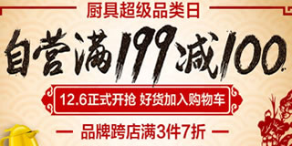京东自营品牌厨具大促活动,跨店3件7折,领199-100/399-200/599-300券。京东厨具活动今天正式开启,跨品牌3件7折,还可领券,额度为199-100,399-200,599-200,此外,今天(12月6日)上午10点还可抢199-188神券。